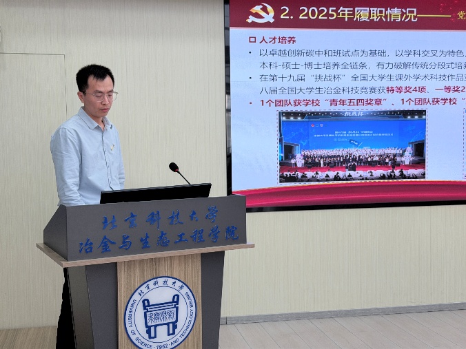 2026年3月19日,冶金与生态工程学院党委在冶金楼616会议室召开2025年度党支部书记抓基层党建工作述职评议会。学院党委委员、班子成员,全体师生党支部书记及党员代表参加会议。会议由冶金党委书记宁晓钧主持。