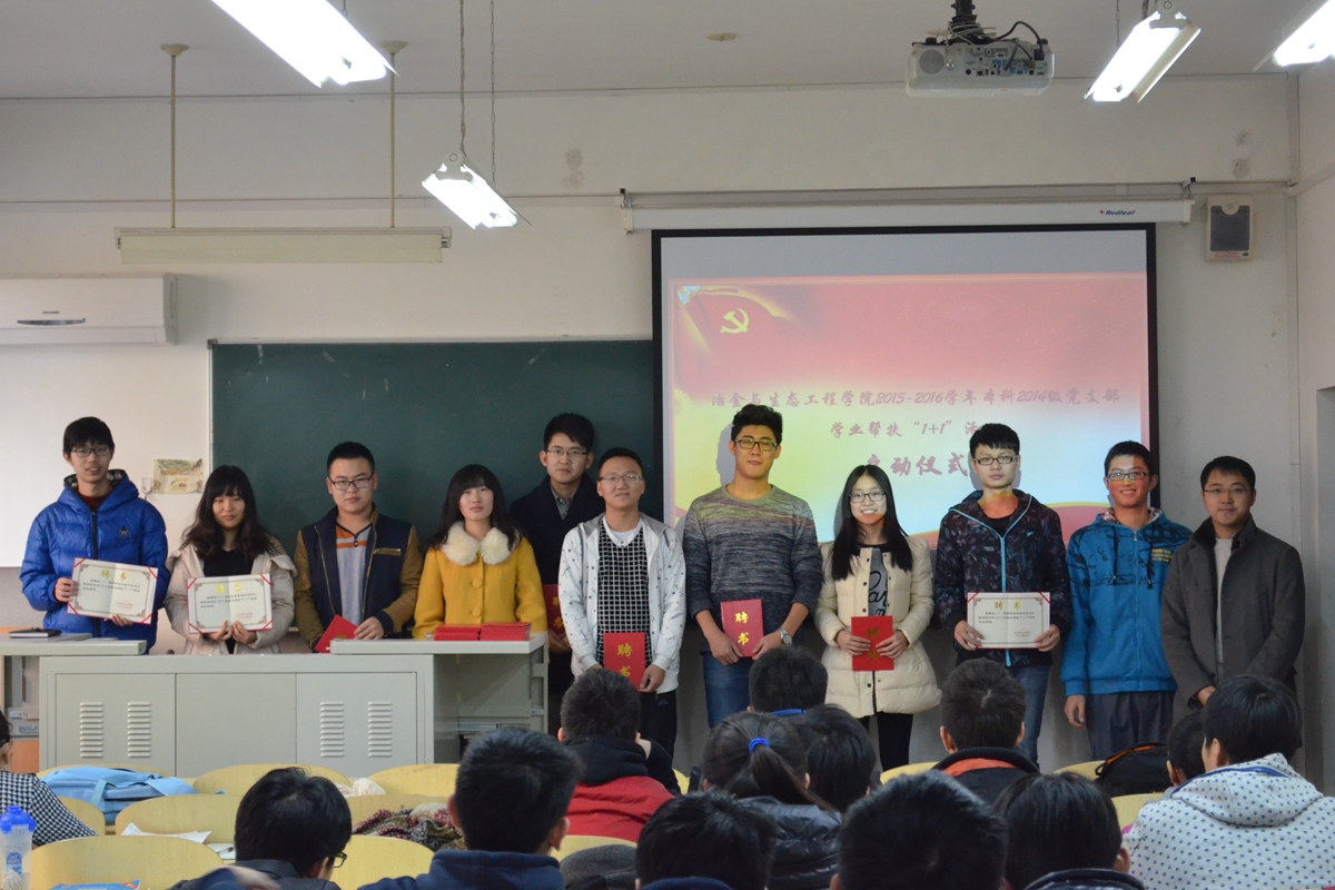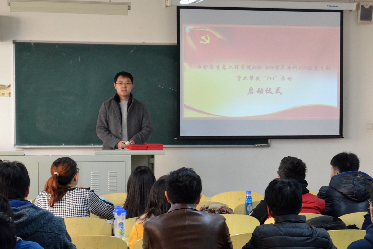 为切实落实学院学风建设工作,帮助学业困难学生解决学业压力,引导学业困难学生端正学习态度、形成科学学习方法, 12月2日下午,冶金与生态工程学院本科2014级党支部在冶金楼举行2015-2016学年学业帮扶“1+1”活动,党支部入党积极分子和年级学业困难同学参加了此次学业帮扶活动的启动仪式。