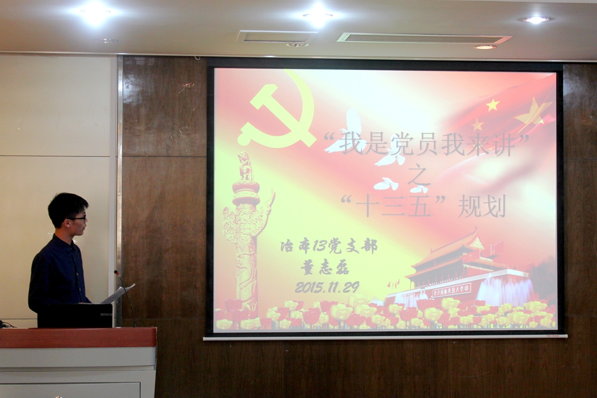 接着董志磊同志谈了他对“十三五”规划的认识和理解,为大家详细地阐述了“十三五”规划的内涵、制定的步骤、六大亮点以及其主要任务和最终全面建成小康社会的总目标。然后,蔡新雨同志对“三严三实”的每一项内容都做了认真地学习和认知,在会上也谈了自己的理解,并且倡导党员以及积极分子都要从身边的小事做起,践行“三严三实”,时刻反省自己的行为。最后进行展示的是白帆同志,他围绕“全面建成小康社会、全面深化改革、全面推进依法治国、全面从严治党”四个全面具体展开论述,分别表达了自己对四者的内涵及其逻辑关系、本质意义等的学习和认识。