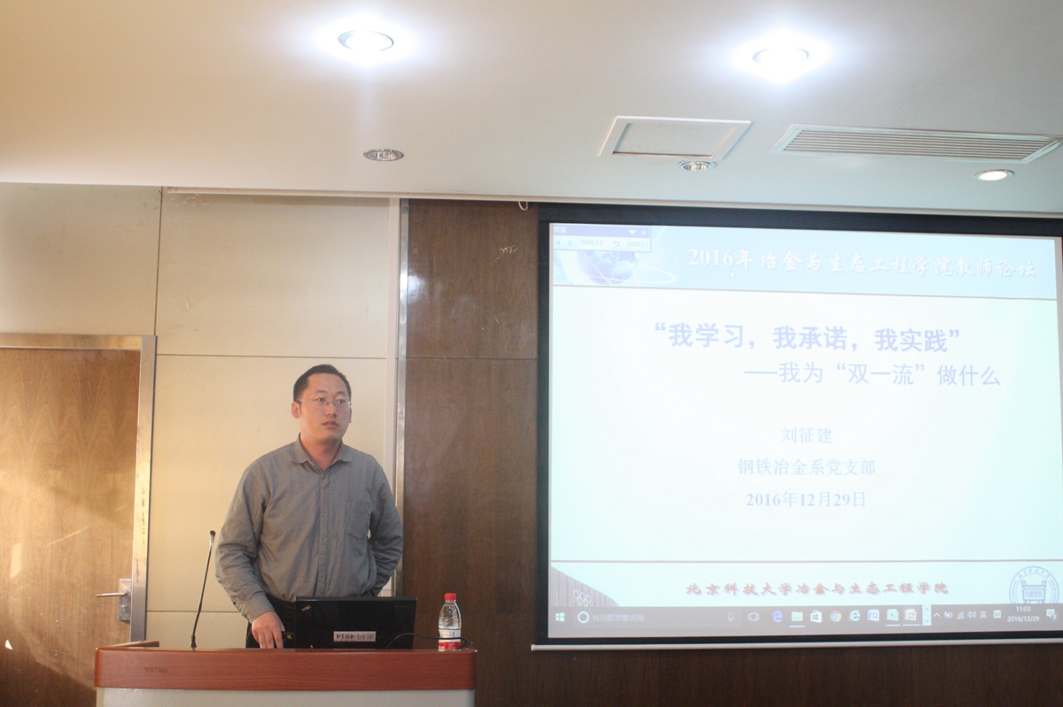 随后,科研教学系列教师代表发言。首先,刘征建老师提出,青年教师应加强自身教学科研素质提高,做好学院教学的“接力”工作,多向经验教师学习,为学院教学工作建设奉献力量。闫柏军老师从冶金物理化学的历史渊源谈到现阶段冶金物理化学学科的发展,同时,对于冶金物理化学前沿所面临的一些挑战提出了自己的建议。曹战民老师指出,为推进世界一流大学和一流学科建设,各位教职工应该多加强自身的理论学习和科学研究。朱荣老师指出,在“两学一做”中,教师要做好自己的教学科研的本职工作,不仅要教学,更要育人。在科研工作中,充分发扬“求实鼎新”的校训精神,做到不忘初心,造福社会。在双一流建设中,要把握中国特色和创新精神,推动我校与国际学校的接轨。刘晓明老师最后指出,办好高校,必须牢牢抓住全面提高人才培养能力的核心点,学院应加强对学生的关心和培养,争取更好的发展。