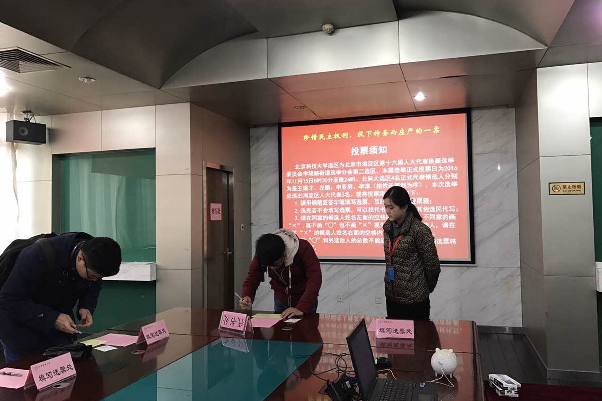 按照海淀区选举工作的整体安排,11月15日为海淀区第十六届人大代表换届选举的投票日。结合学校及学院实际,冶金与生态工程学院在冶金生态楼318会议室设置了选举站。学院领导高度重视换届选举工作,精心部署、周密安排,广大选民热情高涨,积极参加投票。11月15日上午7点30分,冶金学院选举工作组全体人员到位,做好投票选举的一切准备工作。8点30分,投票正式开始。冶金学院选举站准时开放投票时间,查验选民证、发放选票、接受选民投票。大会平稳有序,选举氛围积极良好。