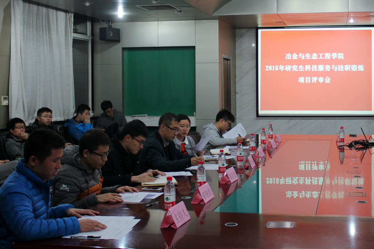 11月1日,冶金与生态工程学院2016年研究生科技服务与挂职锻炼评审会在冶金生态楼举行,本年度立项团队依次进行项目总结汇报。冶金学院、冶金国重研究生辅导员陈曦、李元坤、侯雨阳、翟晓波、武文合、黄正欣担任评委。评审会由学院研究生会副主席陈威同学主持。硕士2016级研究生代表现场观摩了答辩环节。