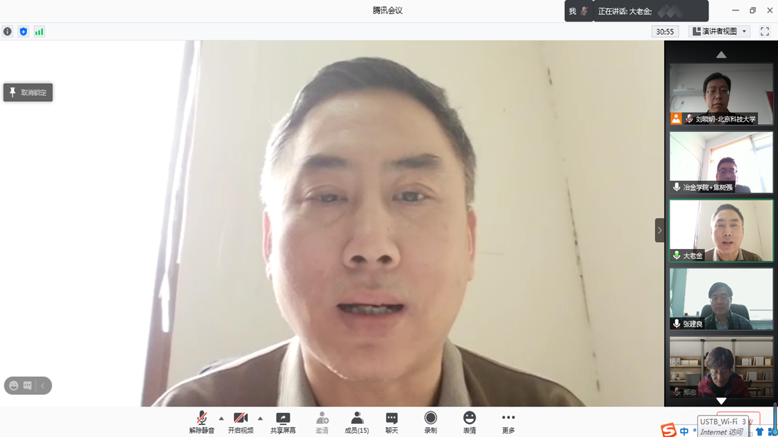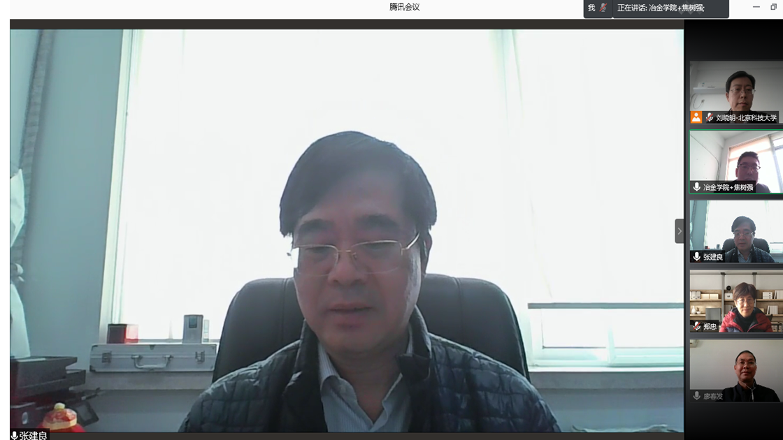 北京科技大学冶金工程国家级实验教学示范中心2020年教学指导委员会年度会议于2021年3月4日14:00-16:00召开,根据疫情防控要求,本次会议通过腾讯会议进行。出席本次会议的有冶金工程教学示范中心教学指导委员会廖春发教授(江西理工大学 主任委员)、郑忠教授(中南大学 委员)、杨建广教授(中南大学 委员)、杜涛(东北大学 委员)、吴胜利教授(北京科技大学 委员),北京科技大学资产管理处金仁东处长、徐宁科长、乔瑞鑫老师,冶金与生态工程学院党委书记张建良教授、院长焦树强教授、示范中心主任刘晓明教授及示范中心代表5人。会议由冶金与生态工程学院院长焦树强教授主持。