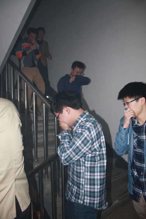 首先,在冶金楼第四层设置模拟着火点、施放烟雾。活动总指挥张百年副院长发出疏散指令。全楼马上启动应急疏散预案:紧急关闭电梯,打开应急疏散门,在定位安全员的指引下,大家有序撤出楼宇。前后历时3分30秒。