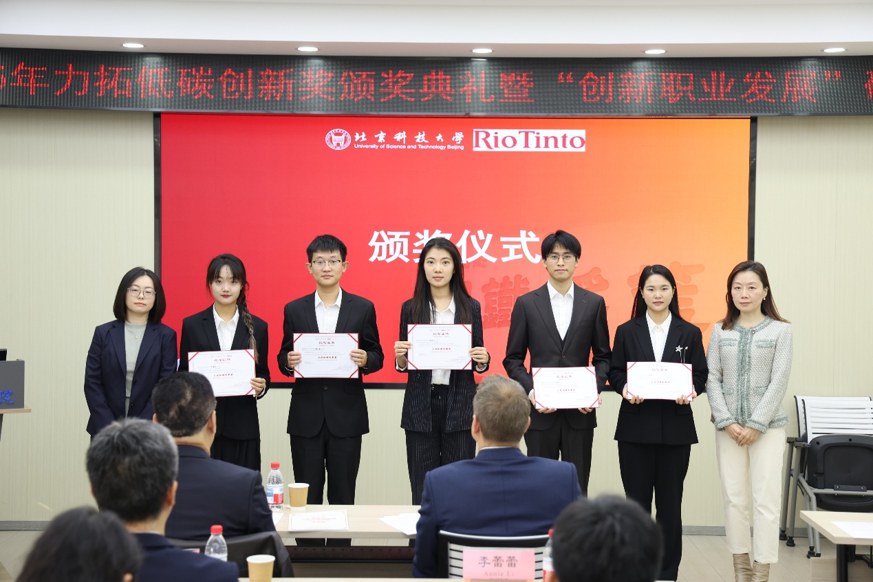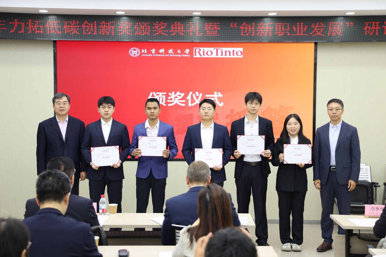 11月12日,2025年力拓低碳创新奖(以下简称“创新奖”)颁奖典礼暨“创新职业发展”研讨会在冶金楼616顺利举行。力拓集团首席创新官段巍(Dan Walker),科技与创新中国区总经理南利辉,中国区首席法律顾问钱雪梅,中国人力资源高级总监李蕾蕾,力拓集团创新高级总监蕾拉(Leila Mosalaeepour),科技与创新中国区总监周宇昂,北京科技大学党委副书记孙景宏,校友会办公室、基金会办公室主任闫奎铭,冶金学部主任张建良,冶金与生态工程学院党委书记宁晓钧,能源与环境工程学院教授苏伟,绿色低碳钢铁冶金全国重点实验室副主任陈潇,资源与安全工程学院副教授肖柏林出席典礼。冶金与生态工程学院党委副书记、副院长康泰主持典礼。