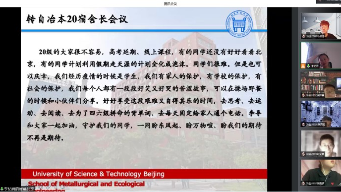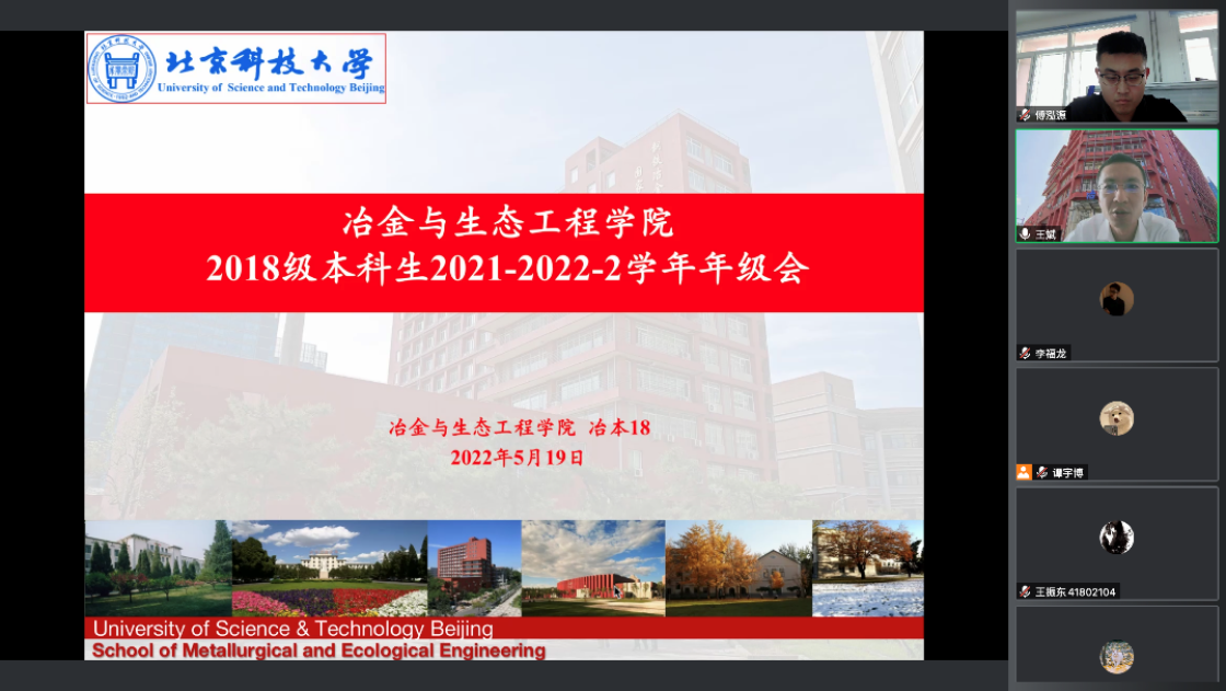 为引导学生共克时艰,进一步增强疫情防控意识,5月17日至5月19日,冶金学院各年级召开年级会6场,覆盖学院本硕博全部学生,冶金与生态工程学院党委副书记、副院长王斌出席全部线上会议,他强调同学们要意识到当前疫情防控工作的必要性与紧迫性,号召同学们坚定战胜疫情的信心,配合好学校相关防控政策,疫情防控期间不转发、散发未经核实的信息,积极发挥青年学子力量,筑牢校园疫情防控安全防线。