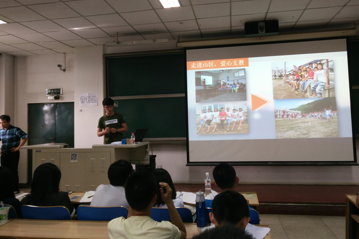 会议伊始,邓雨平以百分比的形式对社会实践的流程以及各阶段所占比重进行了简要分析,随后由本科14级优秀实践团队代表进行团队展示。栾益锋、马豪、马双飞和邓雨平四位同学分别结合各自团队的实际情况,在课题选择、前期准备、实践过程和成果转化等方面进行了详实细致的阐述和分享,对于实践过程中可能出现的一系列问题以及解决方案进行了综合解释。