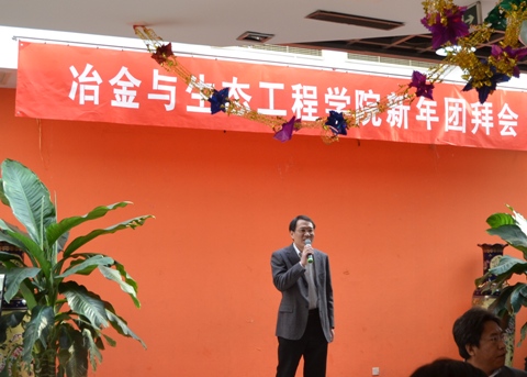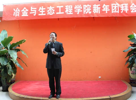 冶金与生态工程学院2012年新年团拜会于12月31日中午12时在万秀园四层隆重举行。校长徐金梧、校党委副书记谢辉、校党委副书记张文明、副校长武德昆、校长助理朱鸿民、学校各机关部处领导、冶金与生态工程学院领导班子、离退休教师及全体教职员工出席了团拜会。
