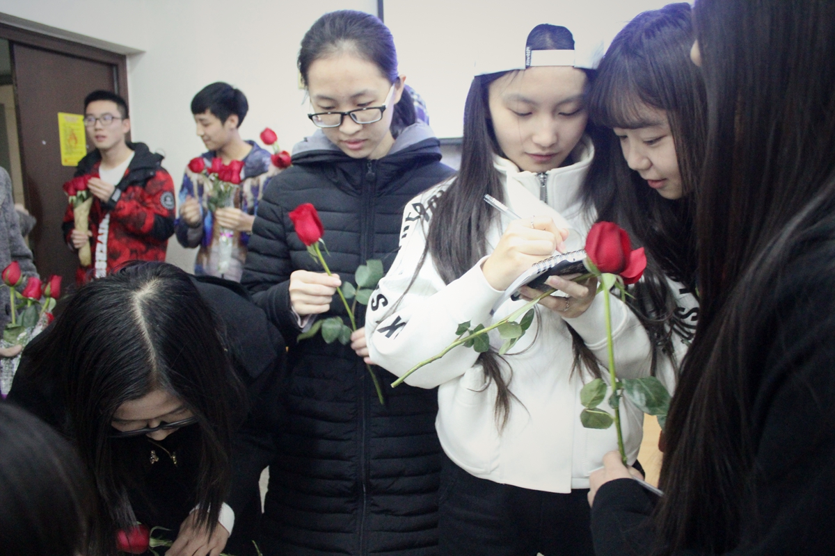 活动开始前班级代表为女生送上玫瑰花,并在任务卡上写出了女生节的愿望。