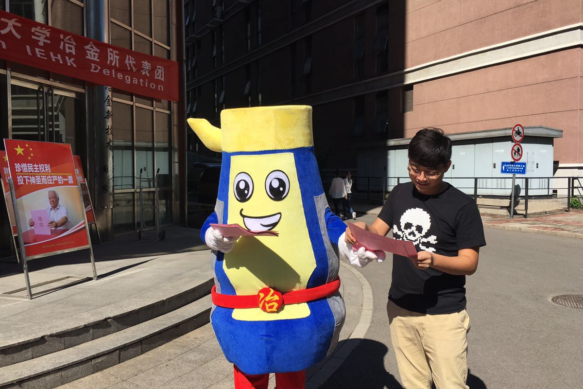 本次宣传活动由冶金与生态工程学院党委安排并顺利进行。上午9点,机关党支部正式开始关于人大代表换届选举宣传活动。在冶金生态楼门前,整齐的摆放着各种宣传展板。冶金与生态工程学院吉祥物“炉宝”为各位师生积极宣传换届选举知识,发放《致全区选民的一封信》。醒目的“主动参加选民登记,依法行使选民权力”条幅一目了然,学校选区工作办公室的各位领导也来到现场参加本次宣传活动,现场宣传氛围十分热烈。