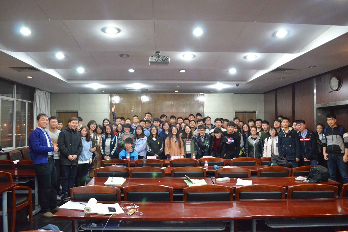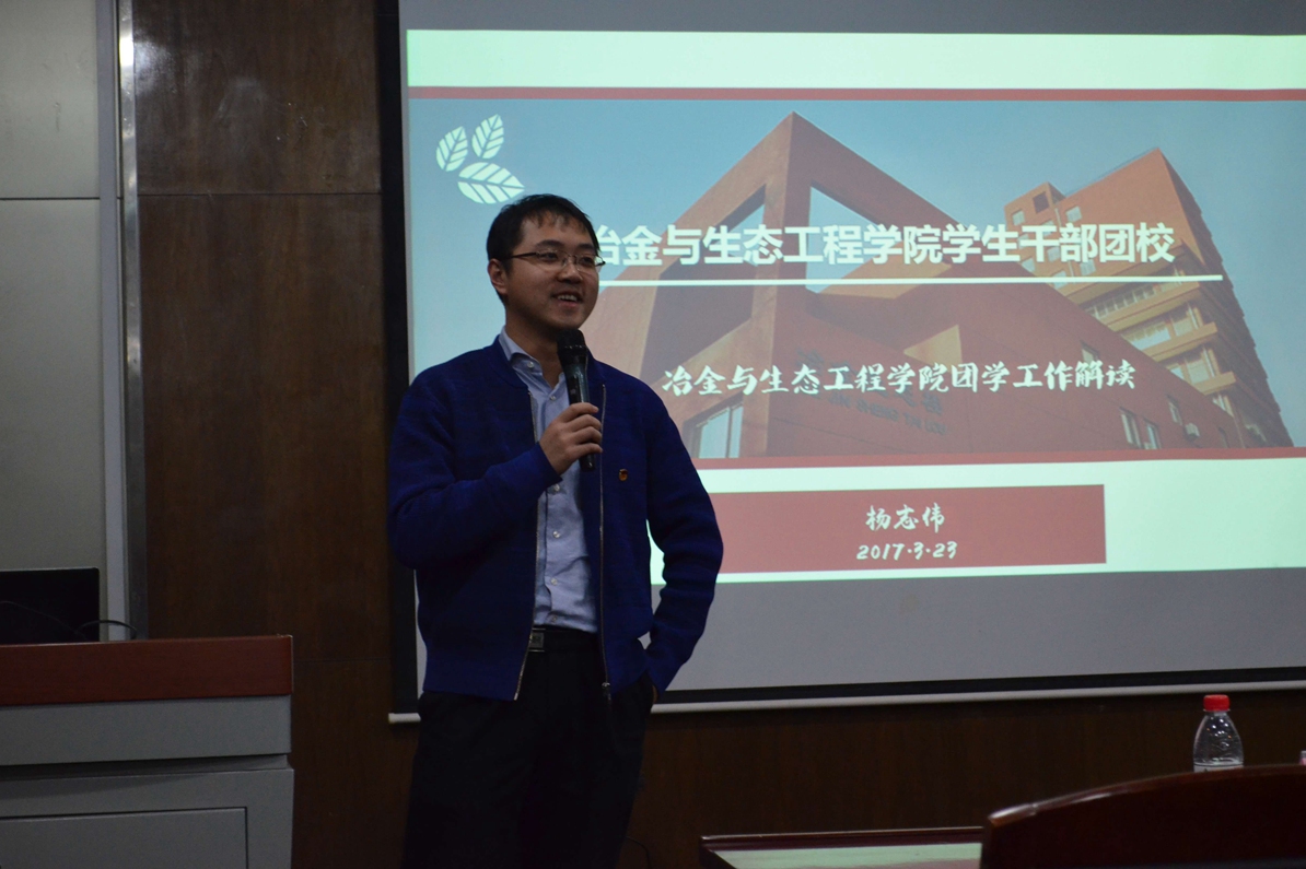 随后,北京科技大学第116期冶金与生态工程学院学生干部团校第一讲正式开始。冶金与生态工程学院团委书记杨志伟老师首先从团学建设思路讲起,围绕着团学工作的宗旨,即“全心全意为同学服务”进行了详细的阐述。接着杨志伟老师又为学员们介绍了团学工作的体系结构,对团委、学生会和新闻中心各个部门的工作重点和职能进行了介绍。杨志伟老师提出了“突出班团核心,推进一体化建设”的组织建设观点。而对于主题教育,杨老师则提出了“紧扣时代主题,增强思想引领”的观点,学员们认真记录,时而发出热情的掌声。对于骨干培养,他提出了具体的工作体系和探索“4+X”骨干培养方案。他强调新闻中心是冶金学院团学工作的根基,举办任何活动时,切忌忘记了根基的重要性。讲解接近尾声,他对学员们提出了三个“不要”。第一:不要幻想“一夜成名”――获得成功是你之前所有努力加起来的结果;第二:不要总把错误归咎于他人――在你总是碰壁的背后你一定是缺少了什么;第三:不要只认为梦想本身才重要――不要只看重目标,要享受努力的过程。三句“不要”简洁而精炼,相信在场的学员们定会从中收获,领悟到许多大学之道。在同学们热烈的掌声中,北京科技大学第116期团校暨冶金与生态工程学院学生干部团校第一讲结束。随后在场的师生干部进行了合影留念。