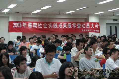 2009年5月16日晚19点,冶金08级暑期社会实践动员大会在机电楼201举行.出席本次大会的有校实践部部长王进老师、冶金与生态工程学院08级辅导员董建、以及三位在社会实践方面取得了优异成绩的学长:季永翔、姚新鑫和杨健。