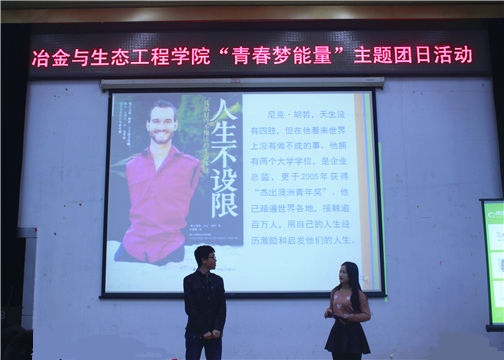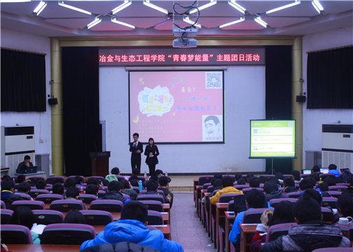 为进一步弘扬冶金与生态工程学院传承的“钢魂”精神,加深学院新生对冶金专业的认识和理解,展示当代大学生的青春活力,学院于2014年12月19日晚在学术报告厅成功举办“青春梦能量”主题团日晚会。冶金学院2014级全体新生与2013级全体学生共同参加晚会并合作表演精彩节目。