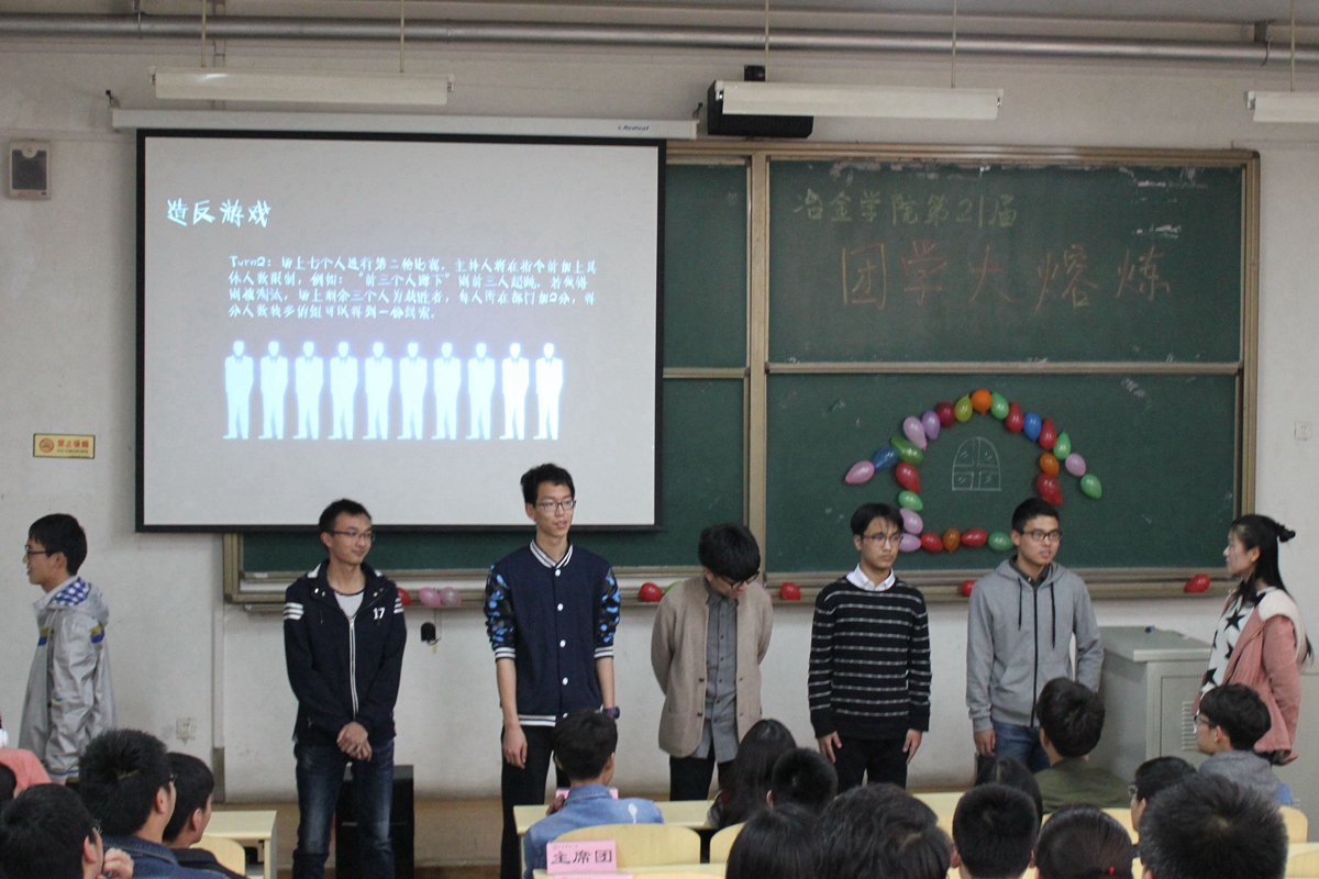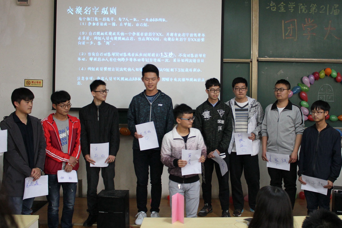 精彩的视频之后,游戏环节更让人跃跃欲试。各类精彩的游戏拉近了大家的距离,在欢声笑语中,冶金与生态工程学院团学大熔炼圆满结束。大家一起在冶金楼合影。本次活动为新老部员、主席以及各部门之间架起了一座友谊大桥,为以后工作的顺利展开和各部门的协调合作打下了良好基础。