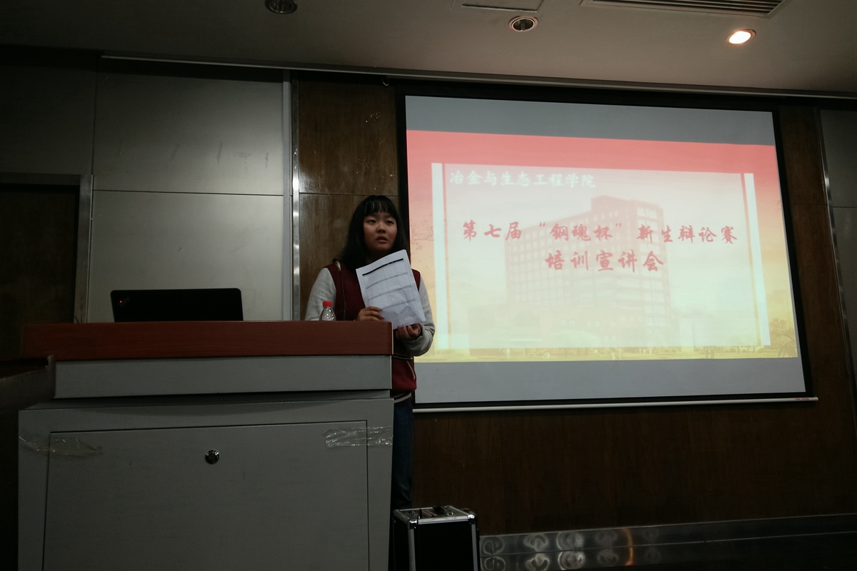 10月16日晚,冶金与生态工程学院第七届“钢魂杯”新生辩论赛培训宣讲会在冶金楼青钢报告厅顺利召开。本次培训宣讲会由冶金1502班王甜雨同学主持,校立言辩论队队长樊婧同学、副队长张静远同学、程婉婷同学对参赛者进行了关于辩论赛的准备工作、辩论技巧和答辩礼仪等方面的培训。